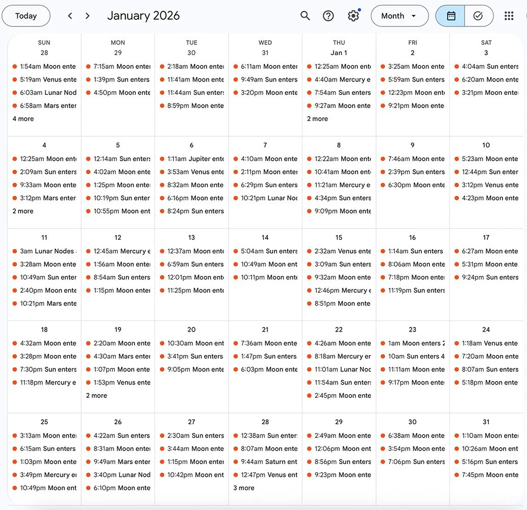 This is one of the simplest ways to start tracking your personal lunar cycle. The lunar transit calendar above is in UTC, and your device will automatically convert everything into your local time — so what you see will always align with your rhythm.